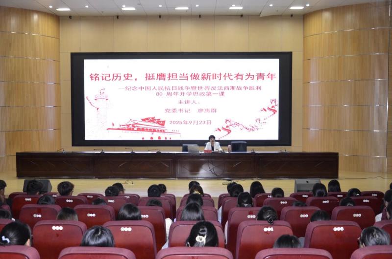 9月23日,js3845金沙线路党委书记廖惠群为师生讲授纪念中华人民抗日战争暨世界反法西斯战争胜利80周年开学思政第一课,激励学生深刻领悟和自觉传承赓续“天下兴亡、匹夫有责的爱国情怀,视死如归、宁死不屈的民族气节,不畏强暴、血战到底的英雄气概,百折不挠、坚忍不拔的必胜信念”的伟大抗战精神,勇担青春时代使命。
