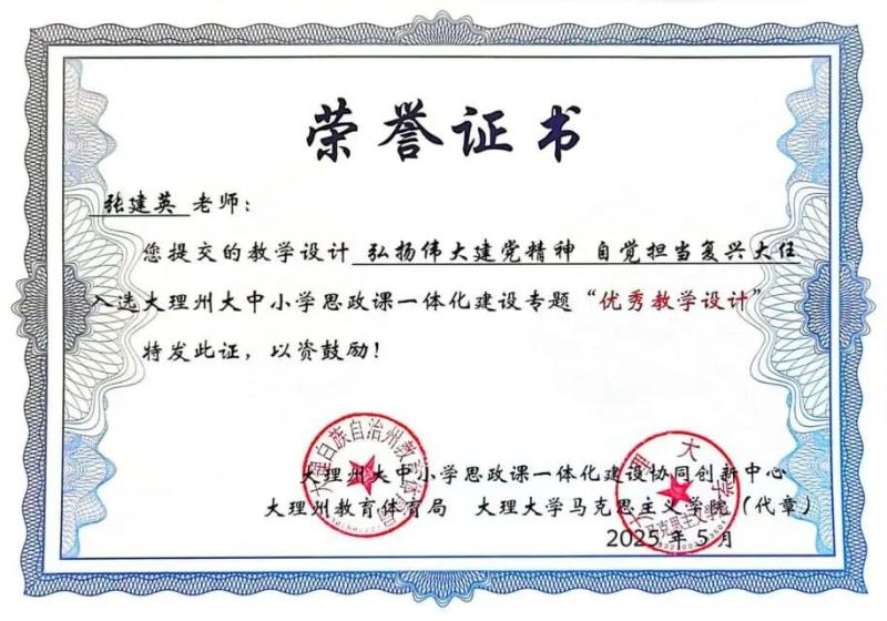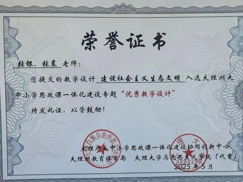 5月,在大理州大中小学思政课一体化建设协同创新中心组织的“大中小学思政课一体化专题教学设计和教学案例评选”中:张建英老师的《弘扬伟大建党精神 自觉担当复兴大任》,张晨、张银老师的《建设社会主义生态文明》,李俊伟老师的《建设社会主义生态文明》入选大理州大中小学思政课一体化建设专题“优秀教学设计”;赵月娟老师的《银幕光影思政课:周末电影日的思想启迪》《继承优良传统 弘扬中国精神》入选大理州大中小学思政课一体化建设专题“优秀教学案例”。