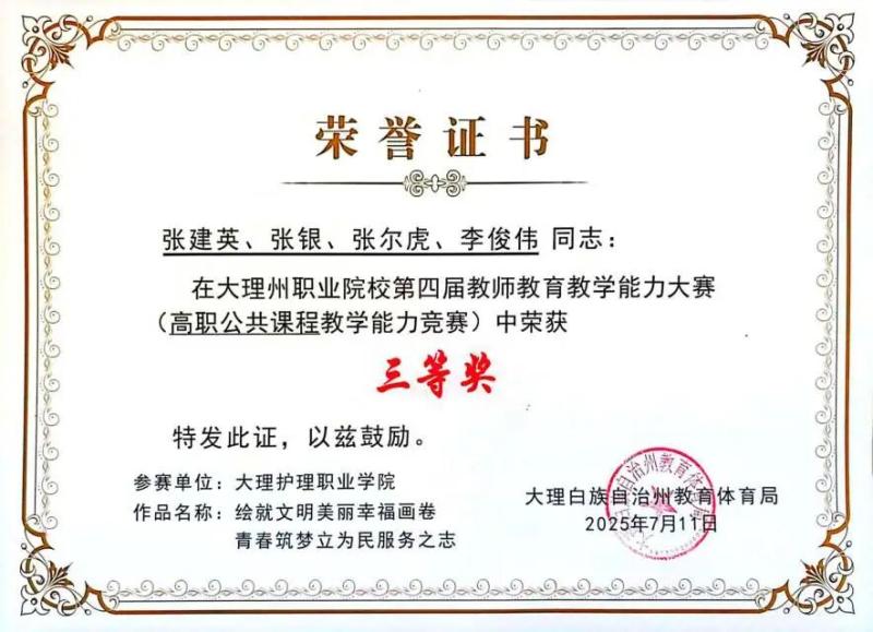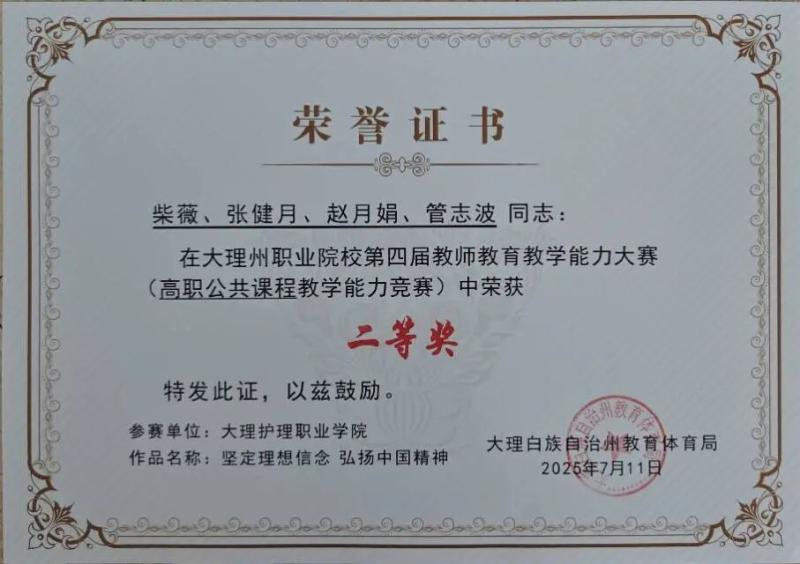 7月,在大理州教体局举办的大理州职业院校第四届教师教育教学能力大赛中:柴薇、张健月、赵月娟、管志波老师团队作品《坚定理想信念 弘扬中国精神》荣获高职组二等奖;张建英、张银、张尔虎、李俊伟老师团队的作品《绘就文明美丽幸福画卷 青春筑梦立为民服务之志》荣获高职组三等奖。