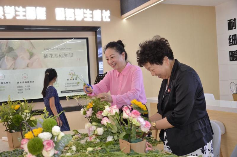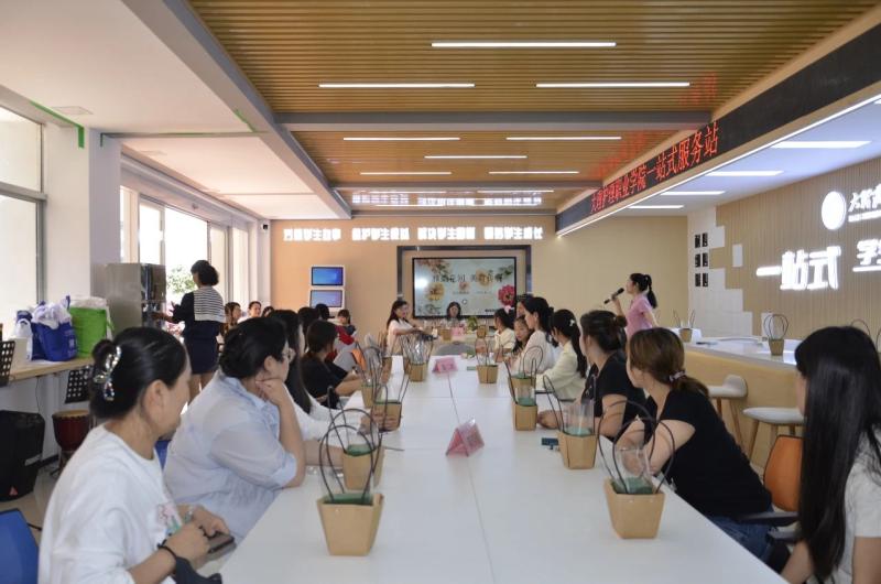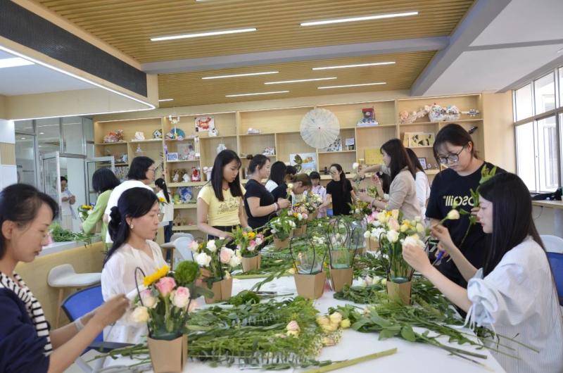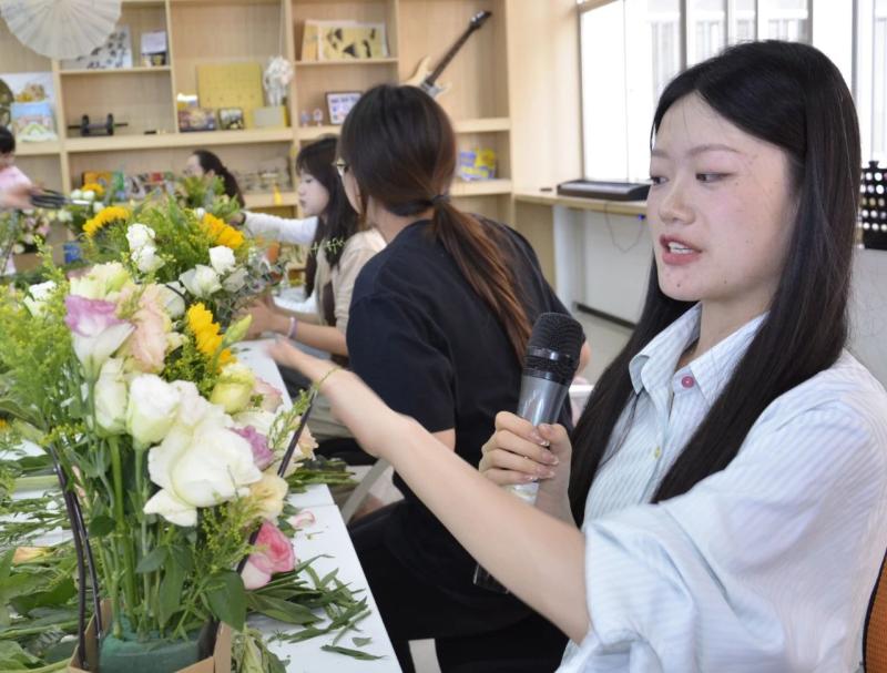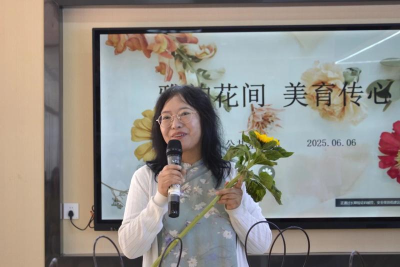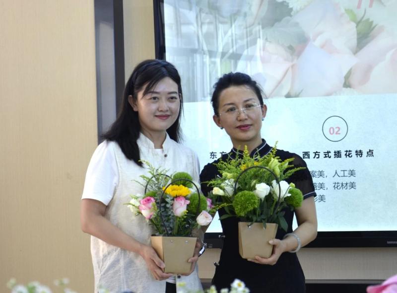 美育传心:以花为媒介,师生向美行。师生们手捧自己创作的花艺作品,积极分享活动心得。一束束鲜花成为传递情感的媒介,一场关于美的深度对话在馨香中流淌开来。学生们在亲手创作中切身领悟到理性与感性的辩证统一,领悟到老师说的“美在过程,美在创造”,她们表达了对这类实践性强的、直观的美育形式的喜爱;老师们在侍弄花草、构建意境的过程中,得以暂时远离喧嚣,获得内心的宁静与审美的愉悦,也在这场别开生面的实践教学中进一步理解了美育的本质,是让知识带着体温落地生根。