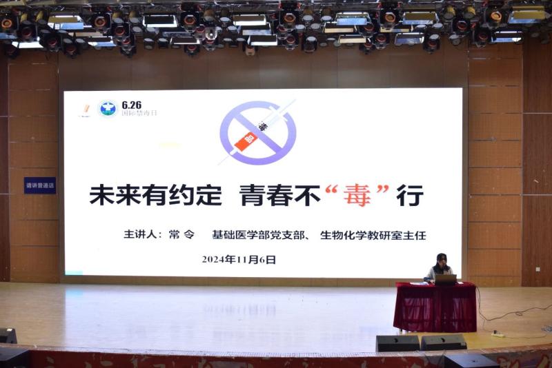 讲座邀请基础医学部党支部、生物化学教研室主任常令老师宣讲。常老师以“未来有约定 ,青春不毒行”为题,从毒品的种类及危害、吸烟和吸毒原因分析、减少毒品危害的策略与措施等三个方面进行详细讲解,着重强调了烟草对于青少年的严重危害,还为同学们发放了防烟禁毒宣传手册。