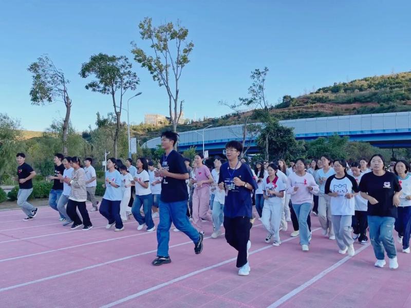 活动首先进行了青春健康知识讲解。专业老师通过生动讲解,普及了疾病预防、生殖健康等内容,提升了师生的健康意识和自我保护能力。在乐跑活动中。师生们佩戴着象征健康与希望的红丝带,迈开矫健的步伐,在足球场上奔跑。红丝带在阳光下随风飘扬,象征着青春的活力与对健康的追求。师生们相互鼓励、相互支持,充分展现了我校师生积极向上、团结协作的精神风貌。
