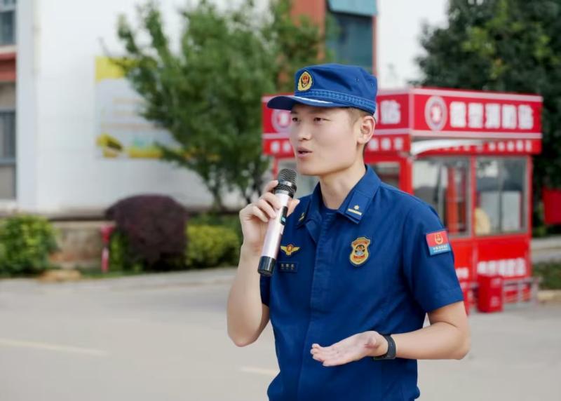 活动中,张雨豪副站长结合实际消防安全案例,为全体师生带来了一场内容丰富、实用性强的消防知识培训课程。他详细讲解了火灾发生的原因、预防火灾的措施以及火灾发生时的正确应对方法,重点演示了灭火器的使用技巧和方法。随后,军训新生代表踊跃上台,进行了灭火器实操体验,亲身感受灭火过程,进一步加深了对灭火技能的理解和掌握。